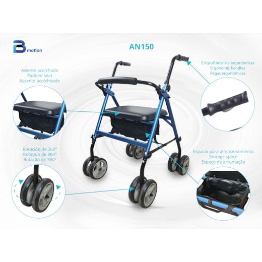 Equipado com um assento almofadado e encosto confortável, permite descansar a qualquer momento. O cesto de armazenamento integrado facilita o transporte de objetos pessoais, e a estrutura em alumínio leve e resistentegarante durabilidade sem comprometer a mobilidade. Além disso, é regulável em altura e dobrável, tornando-se fácil de guardar e transportar.