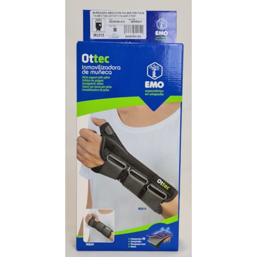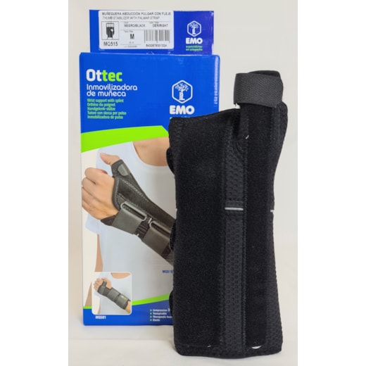 Órtese projetada para imobilização do punho e do polegar, combinando tala palmar e tala radial de alumínio ajustáveis para suporte anatômico e personalizado.
